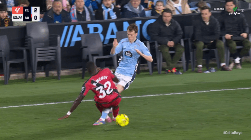 Tras recibir el segundo, Íñigo Pérez decidió incorporar a Nteka para añadir sabia nueva en el ataque. El batacazo llegó cuando el central senegalés, Nobel Mendy, vio tarjeta roja directa al realizar una dura entrada sobre Williot Swedberg, quedándose el Rayo en inferioridad numérica a falta de 25 minutos del final. El propio atacante sueco del Celta pudo hacer el tercero, pero no logró conectar de forma limpia con el balón.