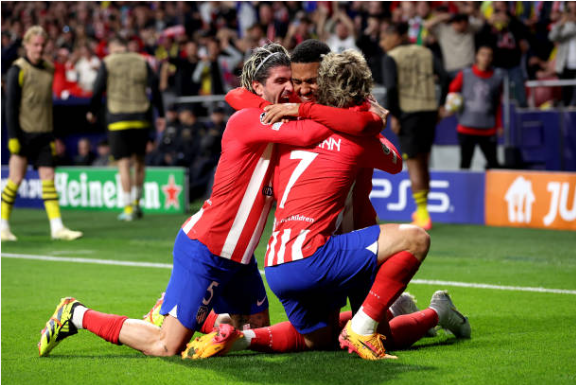 Atlético de Madrid celebrando un gol en la UEFA Champions League : Los jugadores del Atlético de Madrid festejaron un gol crucial en casa, mostrando su fortaleza en el estadio Metropolitano.