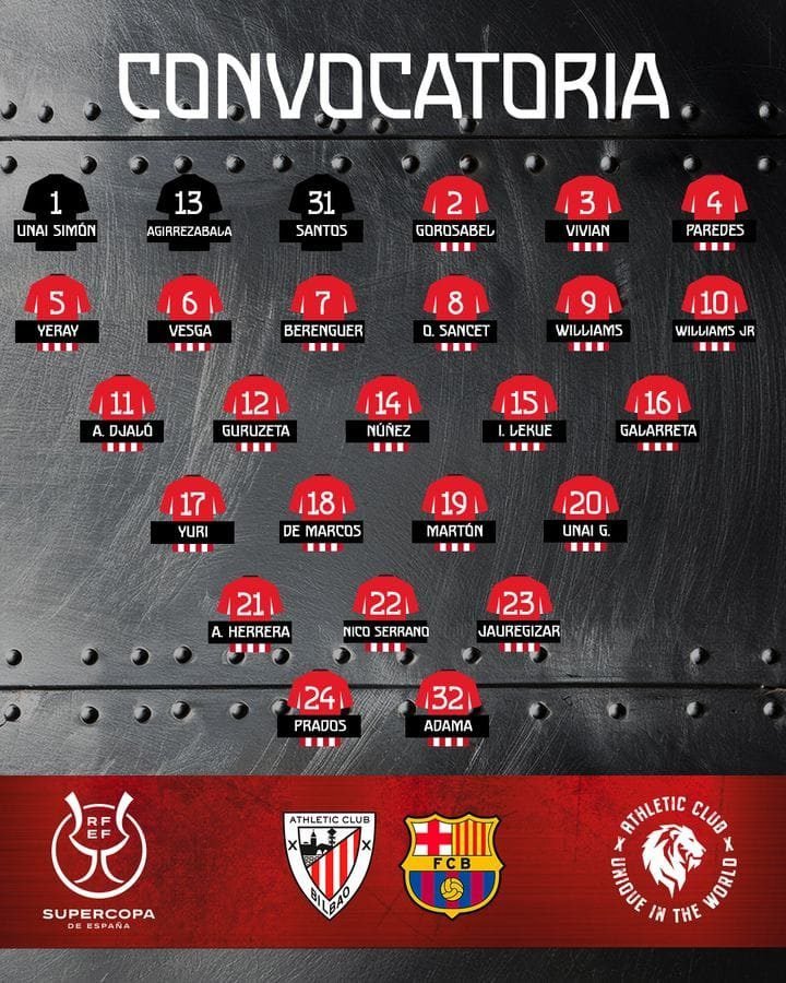 Asimismo, Valverde ha decidido incluir a los 3 jugadores que estaban con molestias como lo son Yeray Álvarez, Oihan Sancet e Iñigo Ruiz de Galarreta, quienes no estuvieron disponibles en el partido de Logroño.