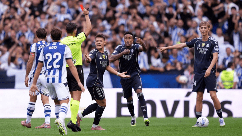 Sin embargo y pese a la superioridad mostrada en el terreno de juego por parte del equipo de la capital, teniendo oportunidades clarísimas, se vio con un jugador menos por la polémica expulsión de Dean Huijsen tras agarrar a Mikel Oyarzabal.