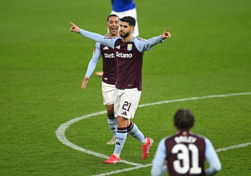 BIRMINGHAM, ENGLAND – FEBRUARY 28: Marco Asensio of Aston Villa celebrates scoring his team’s second goal during the Emirates FA Cup Fifth Round match between Aston Villa and Cardiff City at Villa Park on February 28, 2025 in Birmingham, England. (Photo by Michael Regan/Getty Images)