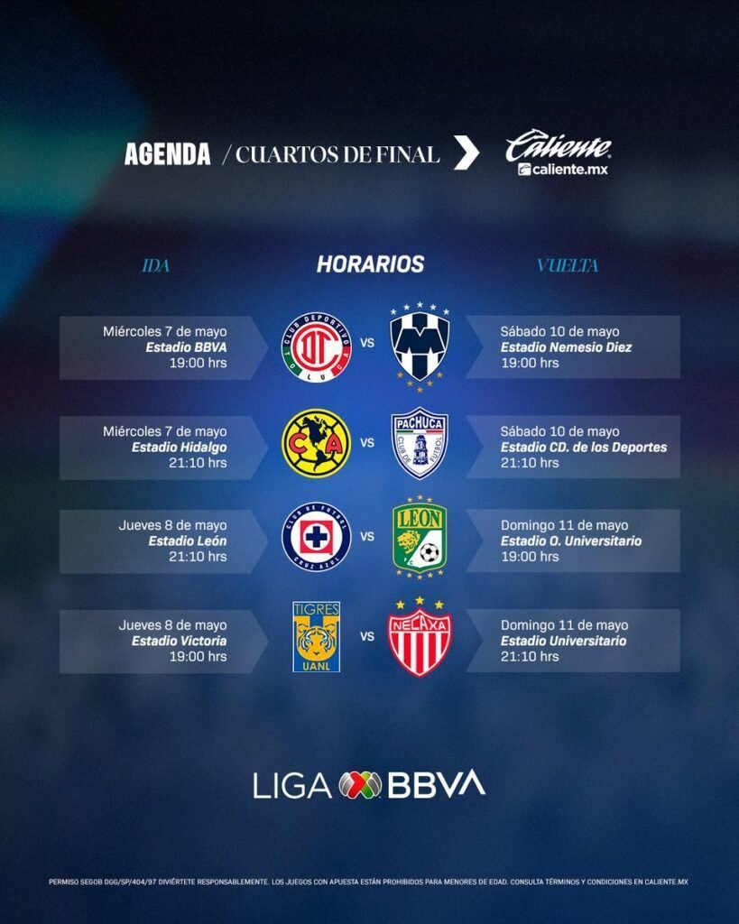 • Clausura 2025: Toluca, Club América, Cruz Azul, Tigres, Necaxa y Club León.