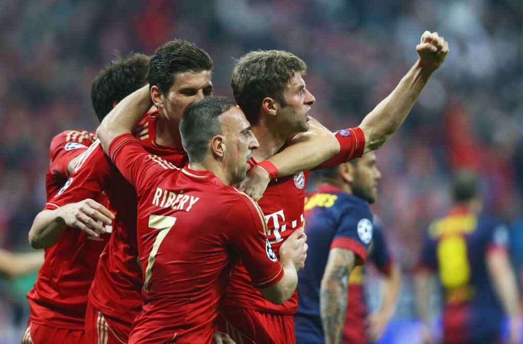 MUNICH, GERMANY – APRIL 23: Thomas Mueller of Bayern Muenchen celebrates scoring the opening goal with Franck Ribery during the UEFA Champions League Semi Final First Leg match between FC Bayern Muenchen and Barcelona at Allianz Arena on April 23, 2013 in Munich, Germany. (Photo by Christof Koepsel/Bongarts/Getty Images)