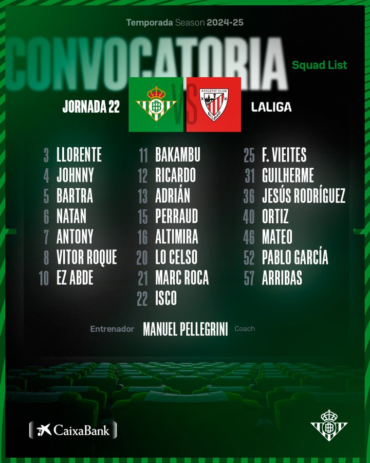 Esta es la lista de jugadores con los que el Betis podrá contar para el partido de esta jornada, con las principales bajas de: Bartra, Carvalho, Ricardo Rodríguez, Chimi Ávila, Bellerín, Fornals, Ruibal todos ellos por lesión y también, la baja de el joven Novel Mendy al recibir tarjeta roja y que volverá tras esta jornada.