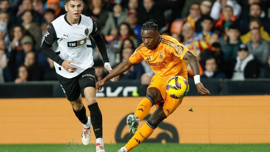 En el tiempo de añadido de la segunda mitad, el árbitro concedió 9 minutos extra, en los que el Valencia (18° con 15 puntos) no pudo consolidar la victoria ante un Real Madrid que puso el 1-2 definitivo, lo que hace que el conjunto blanco se coloque líder con 43 puntos.